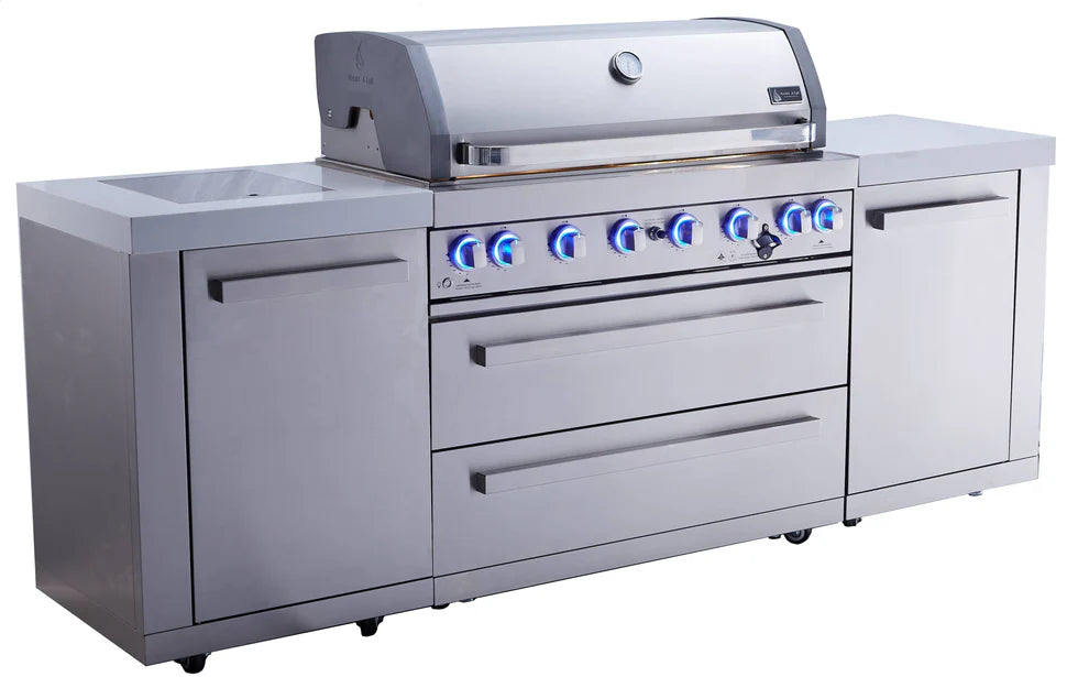 Get serious about your grilling with this 6-burner 38x18” grill and its 2 additional infrared burners, that will have you crafting impressive meals in no time. Grill enthusiasts will appreciate the even heat distribution and extra burners for searing and boiling that the Mont Alpi delivers. After grilling, meals stay hot and ready for guests with the handy warming rack. When the sun goes down, the interior halogen grill lights and color-changing LED lights on control knobs make grilling effortless. The Mont Alpi MAi805 includes: